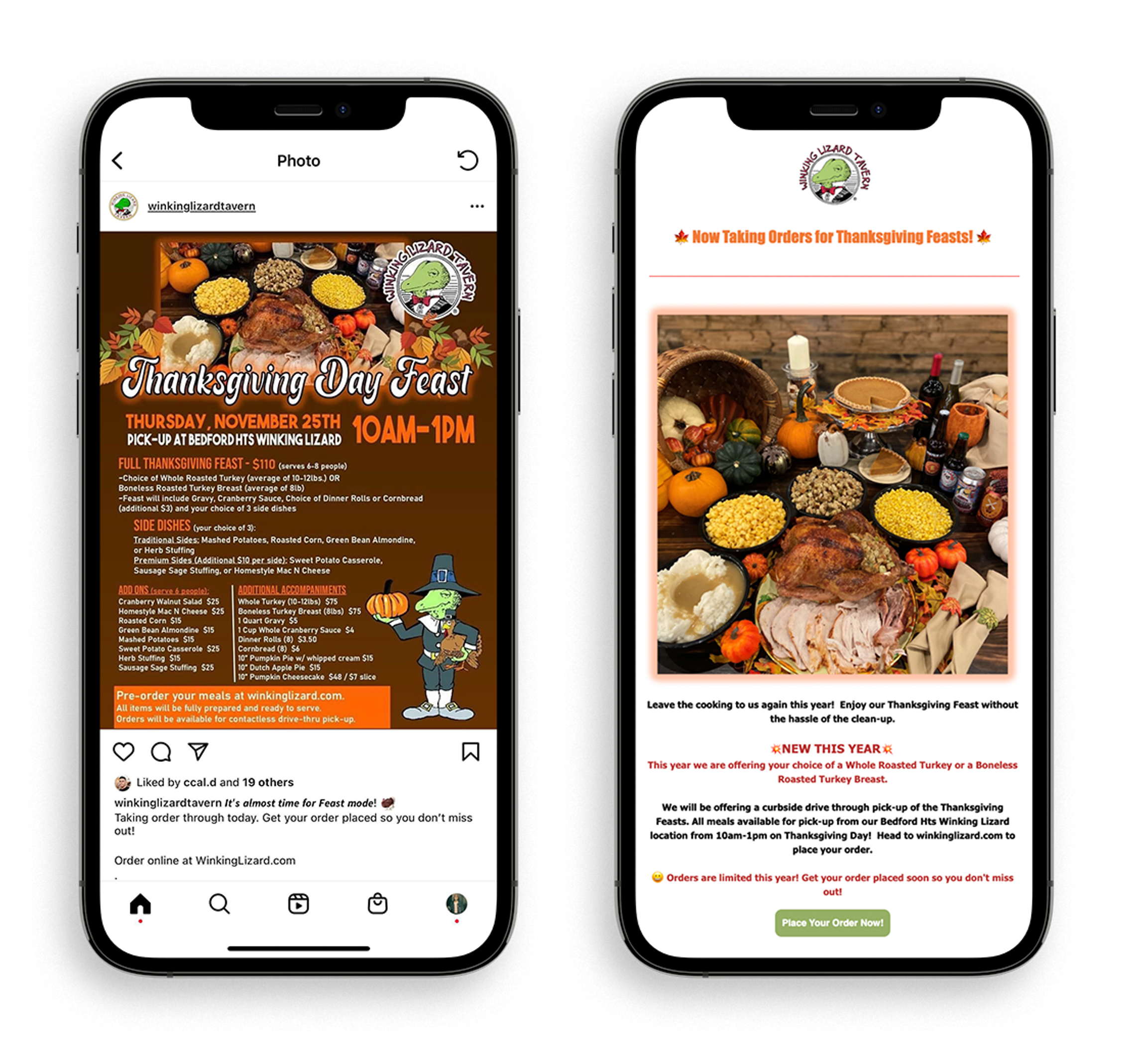 Tons of restaurants offer dinner service and/or special menus for takeout and delivery around Thanksgiving. Whether you’re offering pre-made meals or hosting a special holiday dinner service, you can open a new revenue stream throughout the holiday season by providing seasonal dining options for guests. Popmenu client, Winking Lizard Tavern earned $20k in one day during their 2021 Thanksgiving ordering event.